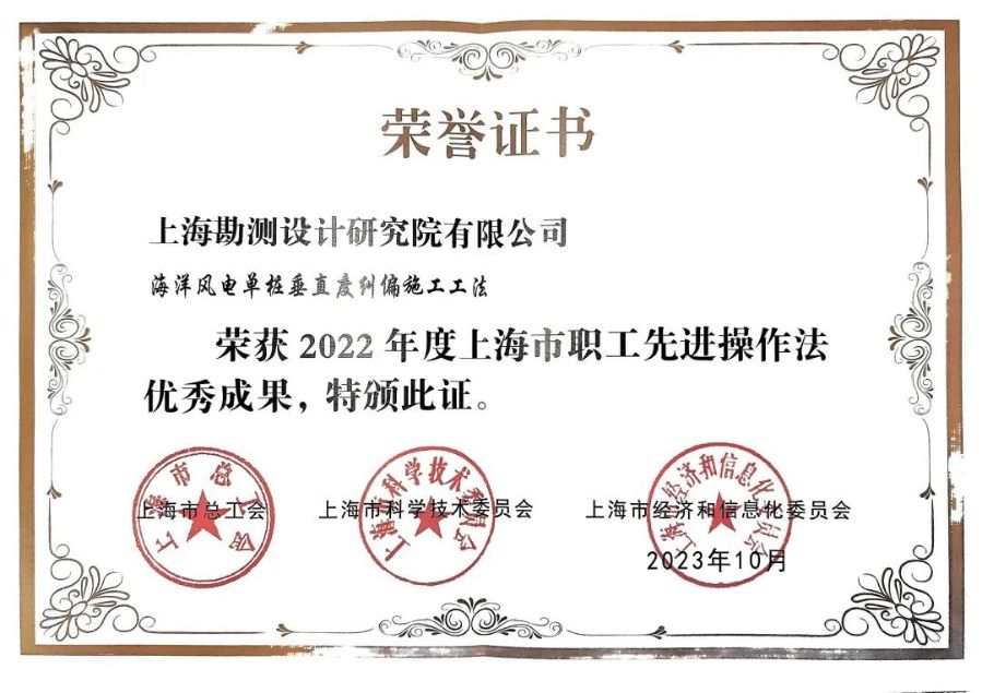 發布時間:2023-12-25近日,在上海市總工會、市科委和市經信委聯合開展的2022年度上海市職工合理化建議和先進操作法優秀成果征集命名工作中,三峽上海院深遠海海上風電建設關鍵技術科技創新團隊(第一發明人:張權)的“海洋風電單樁垂直度糾偏施工工法”榮獲2022年度...