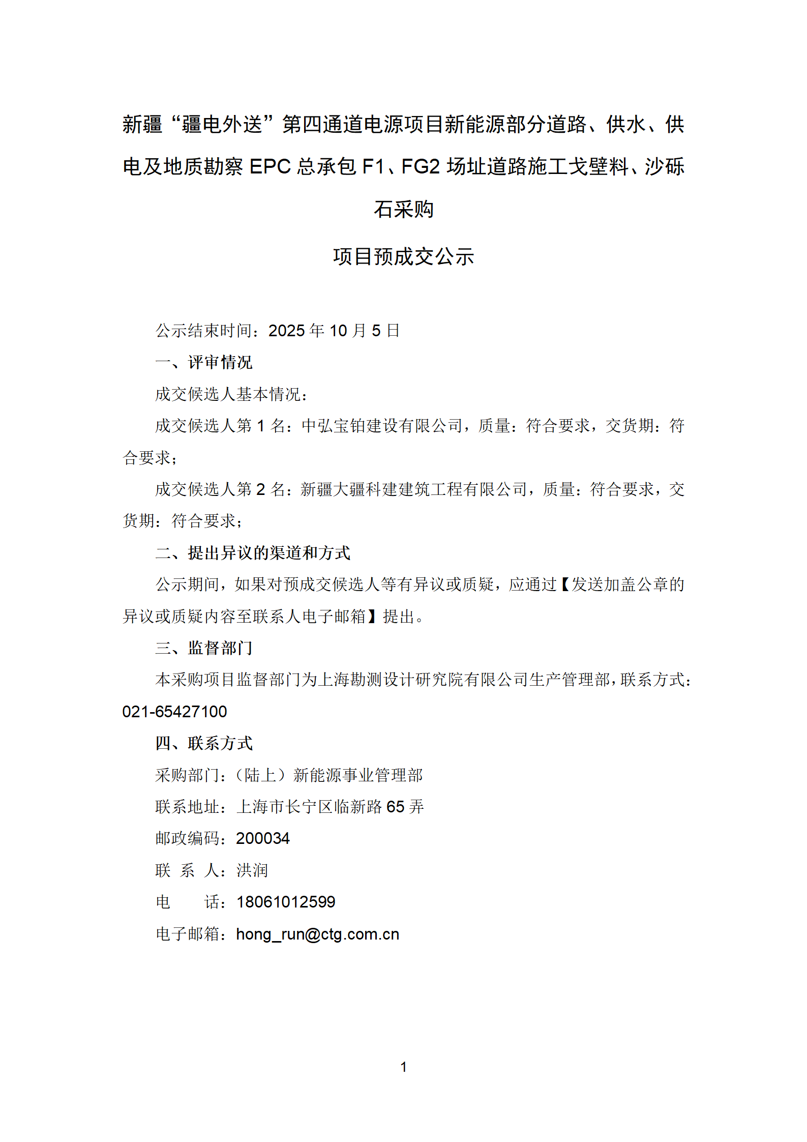新疆“疆電外送”第四通道電源項目新能源部分道路、供水、供電及地質勘察EPC總承包F1、FG2場址道路施工戈壁料、沙礫石采購-預成交公示